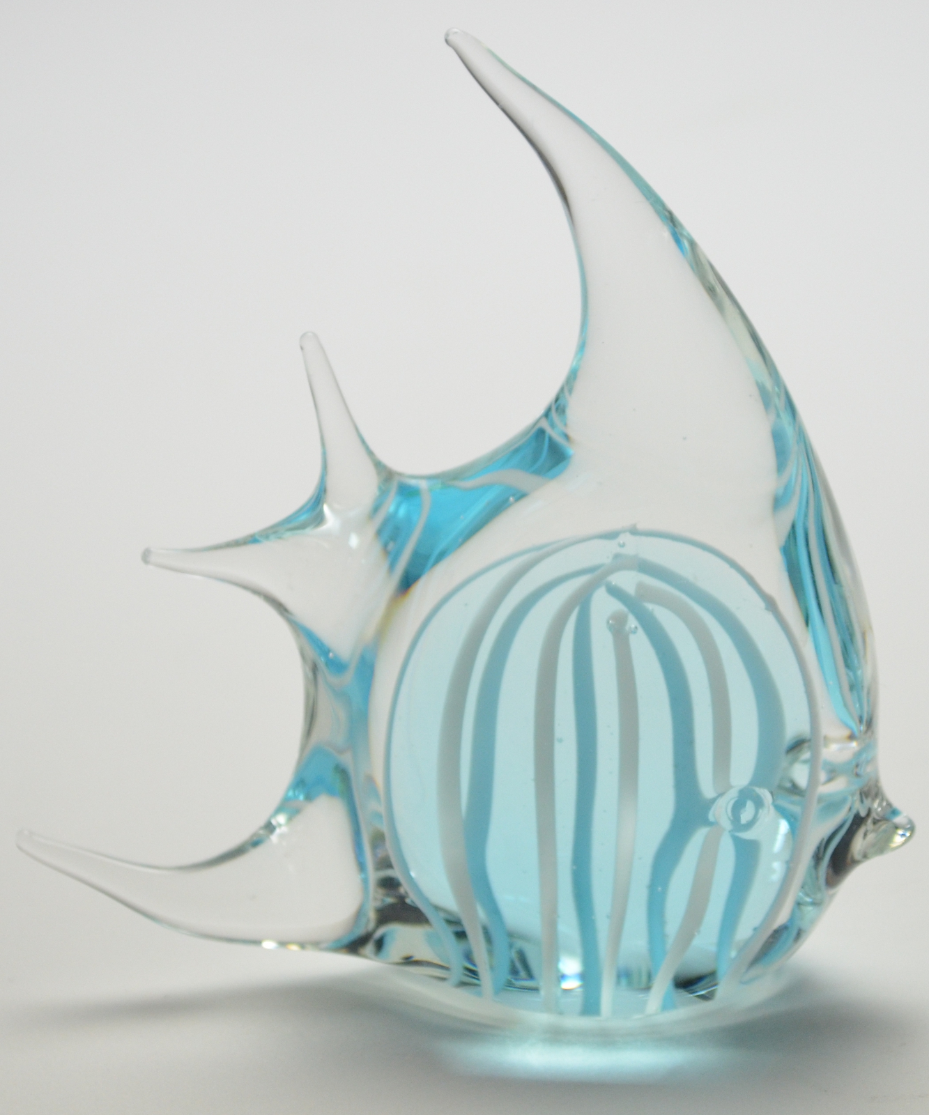 Let this gorgeous fish paperweight transform your workspace into a tropical oasis! This piece pays homage to tropical beaches, palm trees, and the playful fish that swim in the blue oceans. Friends will be envious of your little slice of the sea, right on your desk. The fish paperweight is made of clear glass, with light blue and white ribbons of color running through the center of it. It stands 5 inches tall, and is in excellent condition. This fish might as well have just leapt out of the ocean - it is free of any cracks or chips! Though this little beauty functions as a paperweight, it is guaranteed to provide artistic flair to your desk. It's rare when function and beauty coincide, but this piece does just that!