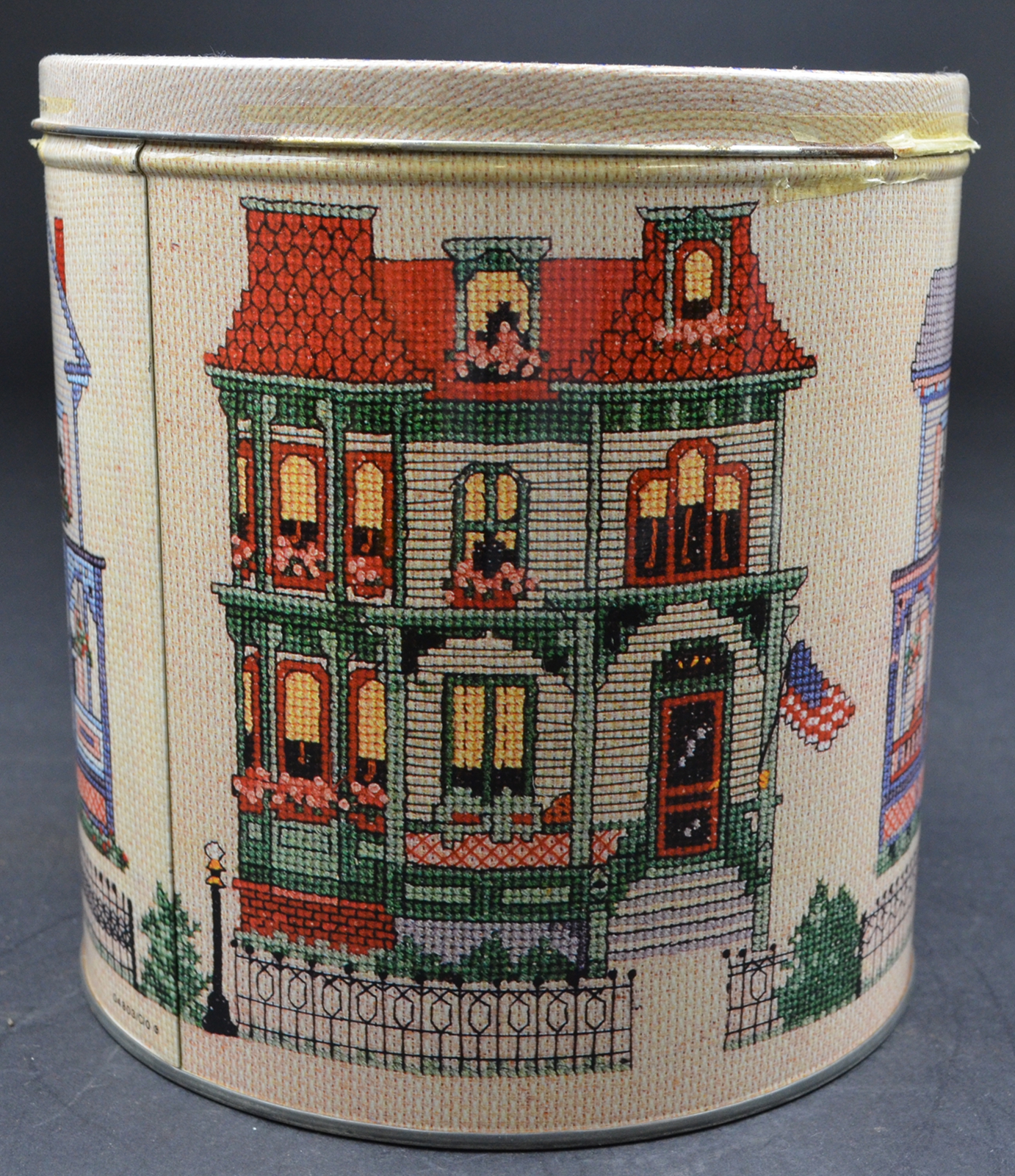 This decorative Dancookie Brands tin has a tall round shape with lots of storage. It features a Cross-Stitch theme that was originally designed by Ferrie Lee Steinmeyer for a Cross-Stitch kit made by Bucilla. The motif on the outside has a background that looks like Cross-Stitching cloth and it features 4 beautiful Cross-Stitched colonial houses. This tin would look great sitting in your crafting area!