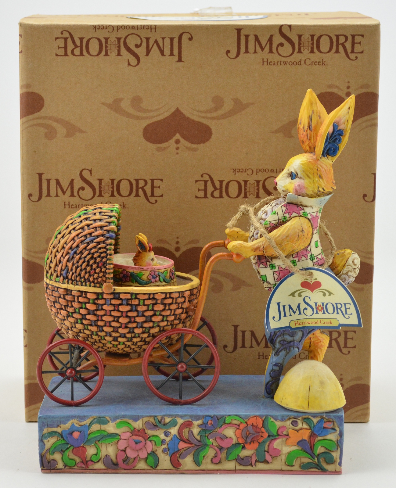 Brighten your home with this adorable Jim Shore resin figurine! This bunny is so quirky and fun that you will find yourself admiring her daily. Place her in an area where she can be seen - this little beauty has a way of putting smiles on people's face! This adorable figurine is made by Jim Shore Designs in 2004. It is aptly titled "You're a Good Egg," (#4001851) and is part of the Heartwood Creek Collection. Manufactured by Enesco, this figurine is a visual feast! It features a yellow bunny rabbit, dressed to the nines in blue pants and a pink and white quilted vest. It is pushing an old-fashioned woven stroller with a large egg within. Here, you will discover a lovely surprise - if you lift the egg, you will find a baby bunny peeking out underneath! The entire scene is placed on a rectangular platform, which has colorful flowers and vines carved into it. This lovely little number is made of stone resin and iron. It features the original tag and box! This figurine is in great condition: please note that the egg is cracked in half. This could easily be mended with some glue, if desired. As this figurine is handmade, I find it incredible that it is so rich with detail and intricacy. It is a remarkable piece. Lucky for you, this bunny and her little one won't hop away, so they will be a part of your home forever! They are bound to bring some spring cheer into your day.